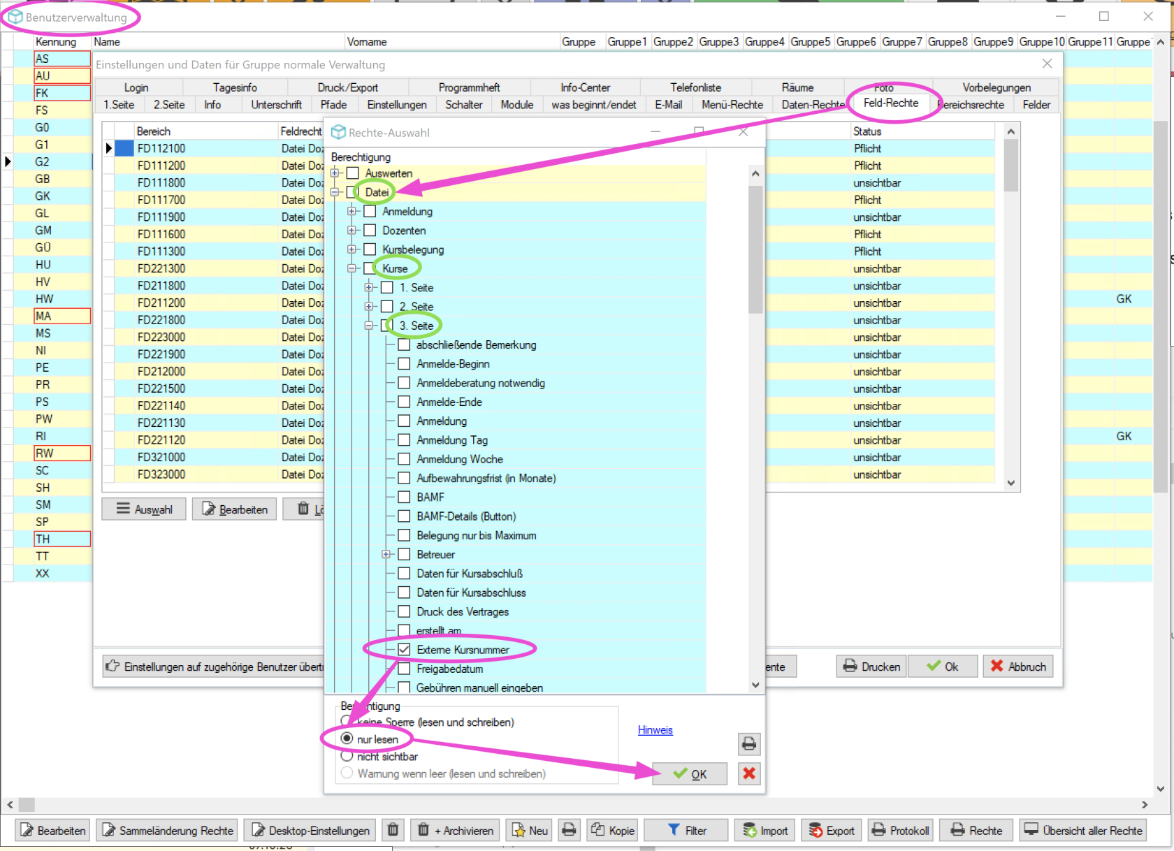 Empfehlung: "Externe Kurs-Nr." auf "nur lesen"