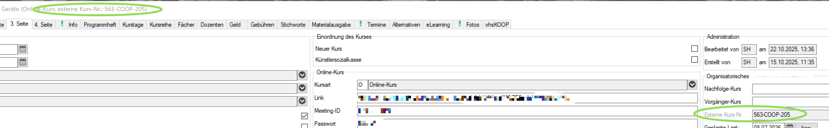 Diese wird in das Feld "exerne Kurs-Nr." geschrieben und ist damit auch im Titel sichtbar: