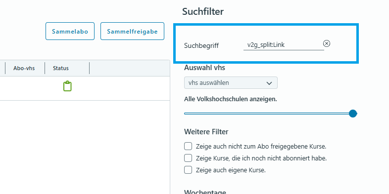 Es kann nach solchen Kursen gesucht werden, indem auf dem Marktplatz "v2g_split:Link" in das Eingabefeld "Suchbegriff" eingeben wird: