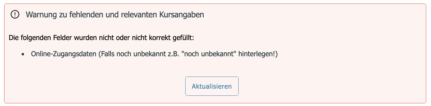 Fehlende/falsche Eingaben im Verwaltungsprogramm können "live" nachgeholt werden - es kann ein paar Minuten dauern, bis die Änderungen synchronisieren, dann kann mittels "Aktualisieren" weitergemacht werden, wenn der Fehler erfolgreich behoben ist: