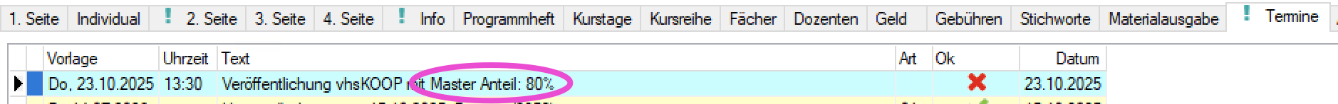 Unter "Termine" kann der "Master-Anteil" (hier 80%) für den konkreten Kurs ermittelt werden: