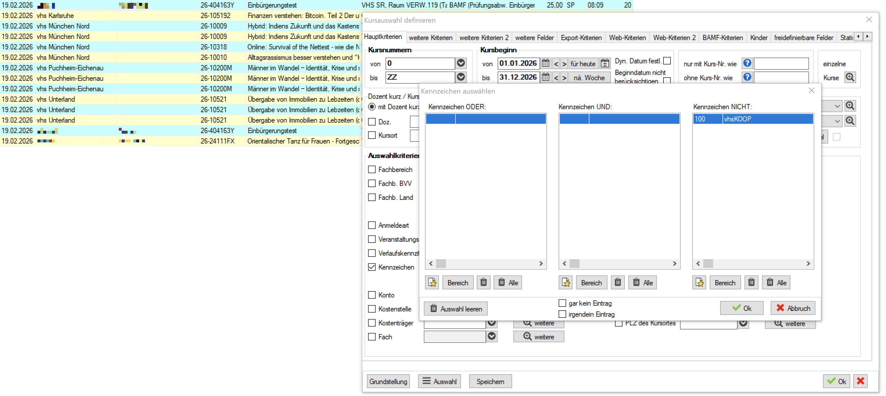Mittels "Kursauswahl" -> "Kennzeichen" -> "Weitere" -> „Kennzeichen NICHT" -> 100 auswählen: